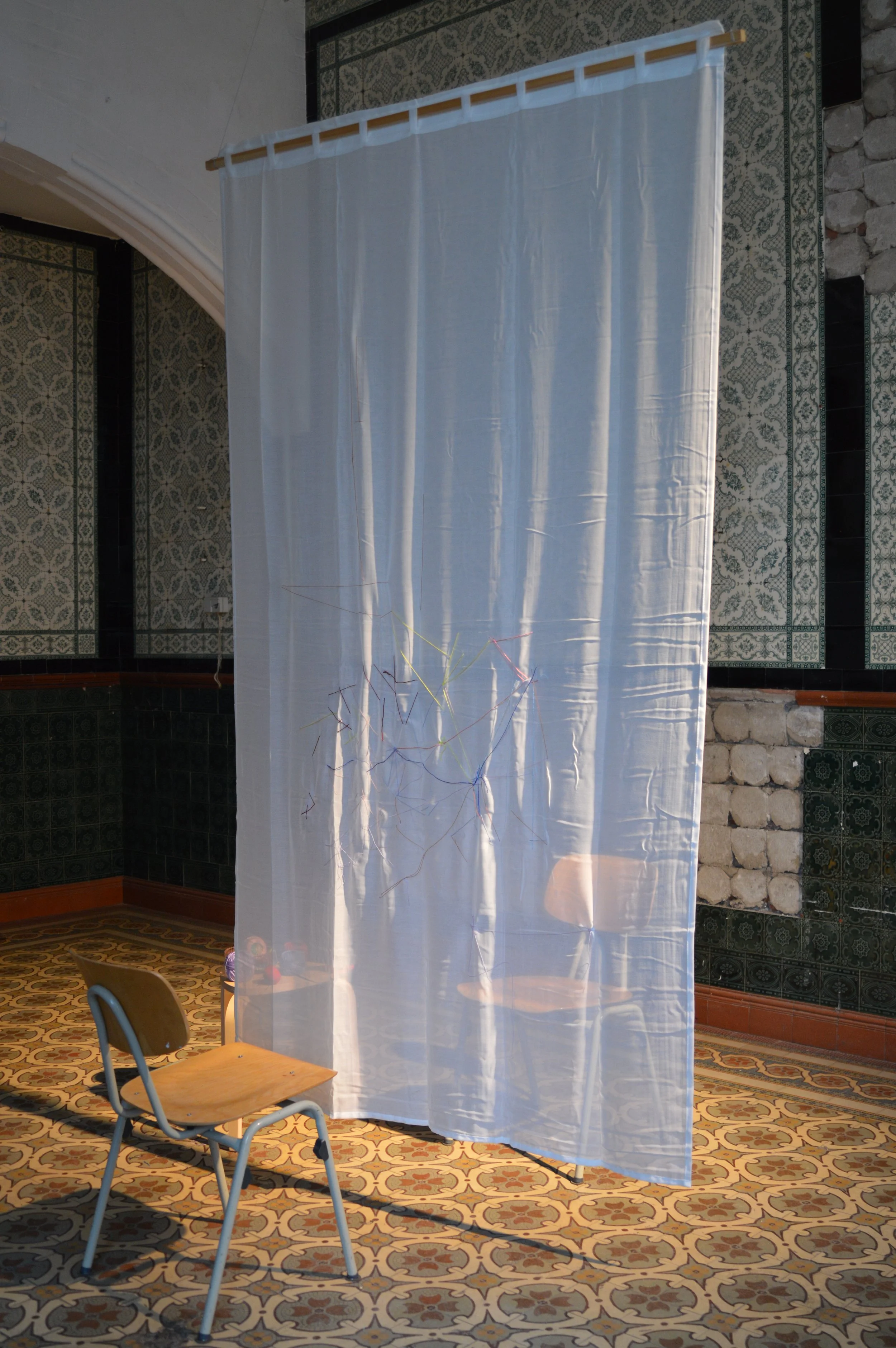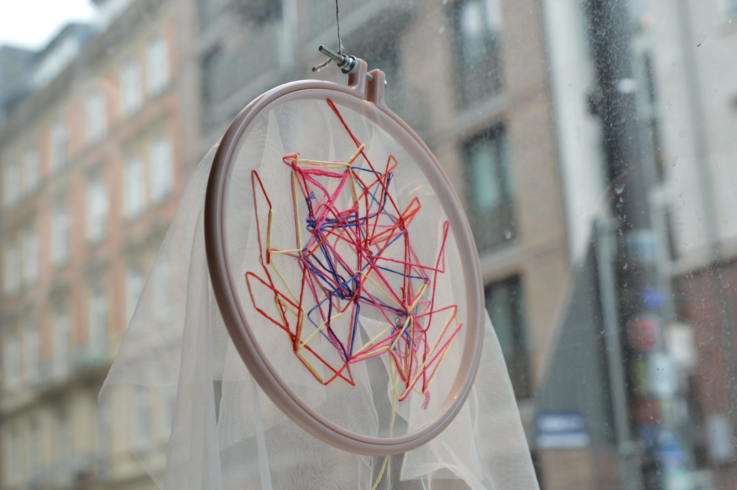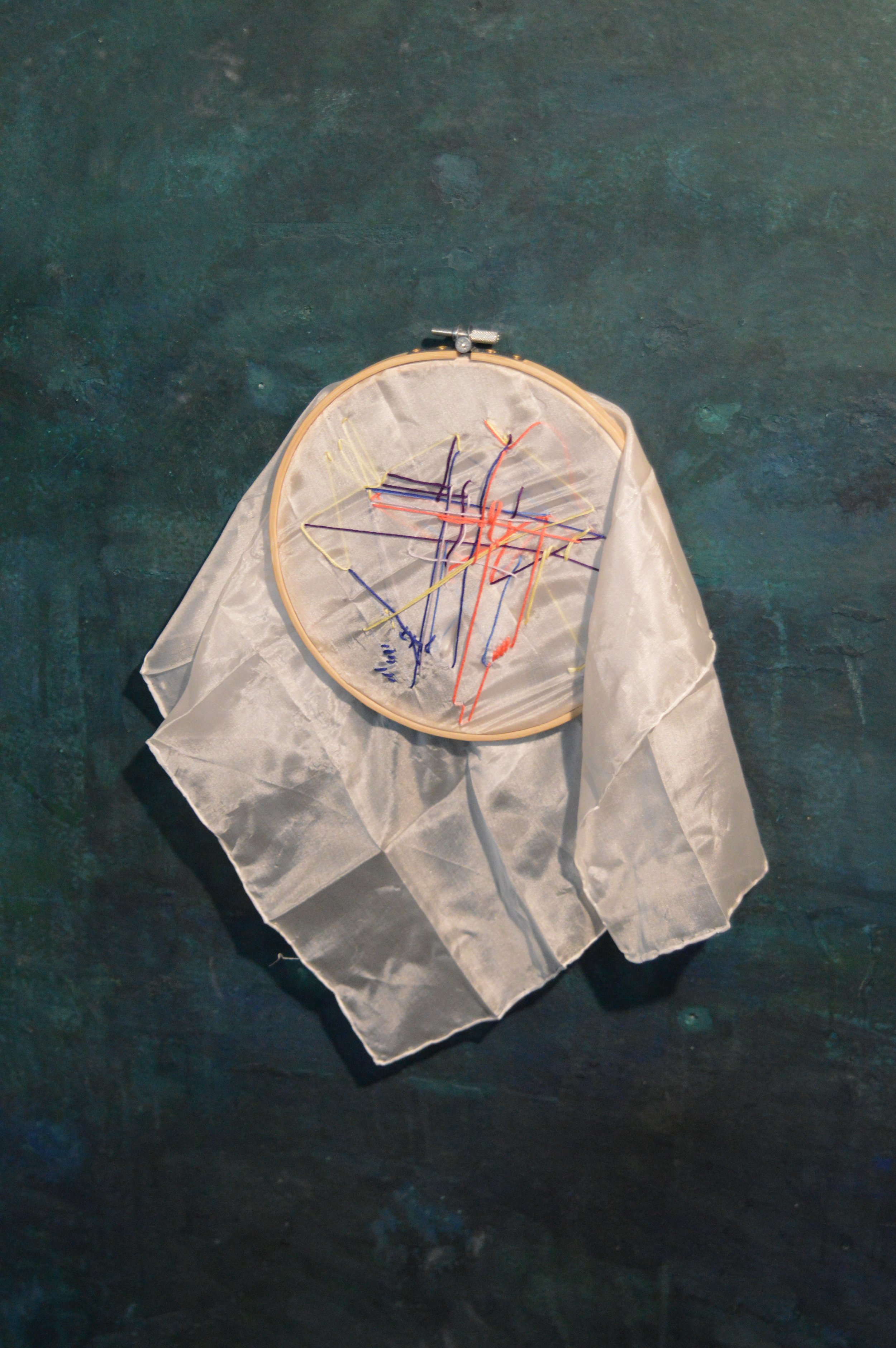 Das entstehende Bild ist kein Abbild der gesprochenen Inhalte, sondern ein intuitives Protokoll ihrer Bewegung. Die Linien folgen keinem vorgegebenen Muster; sie zeichnen die Wege der Sprache nach, kreuzen sich, ordnen sich neu, überlagern sich und laufen auseinander. Für Außenstehende bleibt die Lesbarkeit dieser Stickerei ungewiss – so wie ein Gespräch immer mehrdeutig bleibt, abhängig von Blickwinkeln, Erfahrungen und inneren Filtern. Der transparente Stoff verweist auf diese Durchlässigkeit: auf die feinen Schichten von Sozialisation, Stimmung und Lebensumständen, die unsere Wahrnehmung der anderen Person färben.